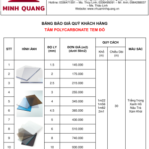 Bảng giá tấm lợp polycarbonate đặc Minh Quang tem đỏ
