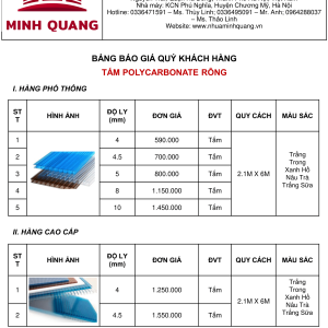 Tấm lợp lấy sáng Polycarbonate rỗng ruột phổ thông Minh Quang là giải pháp hoàn hảo cho những ai đang tìm kiếm một vật liệu vừa đảm bảo tính thẩm mỹ, vừa tiết kiệm năng lượng. Với khả năng truyền sáng tuyệt vời, cách nhiệt hiệu quả và độ bền cao, tấm lợp ruột phổ thông Minh Quang đang trở thành lựa chọn hàng đầu cho nhiều công trình xây dựng. Hãy cùng Nhựa Minh Quang tìm hiểu chi tiết hơn về sản phẩm này để nâng cấp không gian sống và làm việc của bạn một cách hiệu quả nhất!