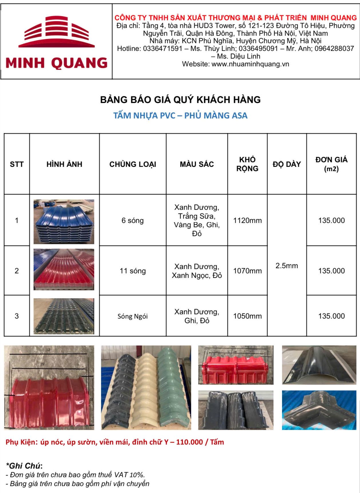 | 1 | 6 sóng | Xanh dương, Trắng sữa, Vàng be, Ghi, Đỏ | 1120mm | 2.5mm | 135.000 |
